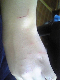 左腕のひっかき傷です痛い(^p^;)<写メが逆さなのは利き手で撮ったから
